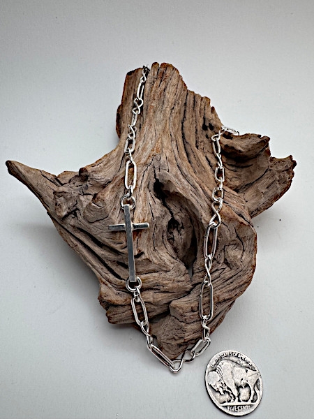 A clean, modern take on a timeless symbol. The Faith Chain features a handcrafted silver spirit link and infinity link design anchored by a sleek, minimalist cross—bold in presence yet refined in detail. Each link offers a balanced weight and fluid movement, making it perfect for everyday wear or layering. The cross is offset allowing a pendant to be added to the chain if desired. 20.5" | $295 Simple, strong, and meaningful—this piece speaks quietly but carries depth. Order Now |