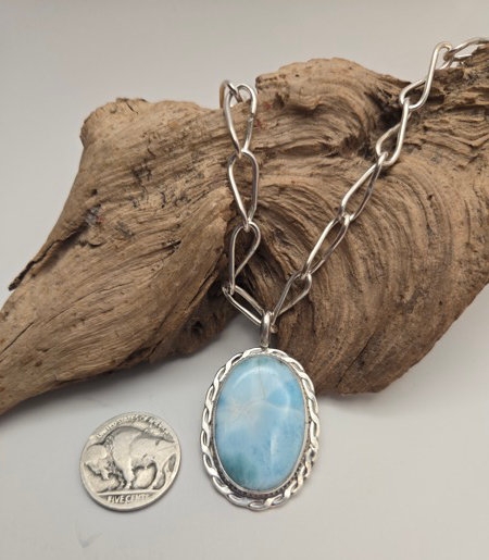 Larimar Pendant features a soft Caribbean blue stone (Pectolite) found in the Dominican Republic and is accented by the flattened twist wire, double bezel and large bail for a chain. I have shown the shiny pendant with our hand made sterling silver revolving chain that measures 18". $175 for the pendant$144 for the chain at 18" Order Now |